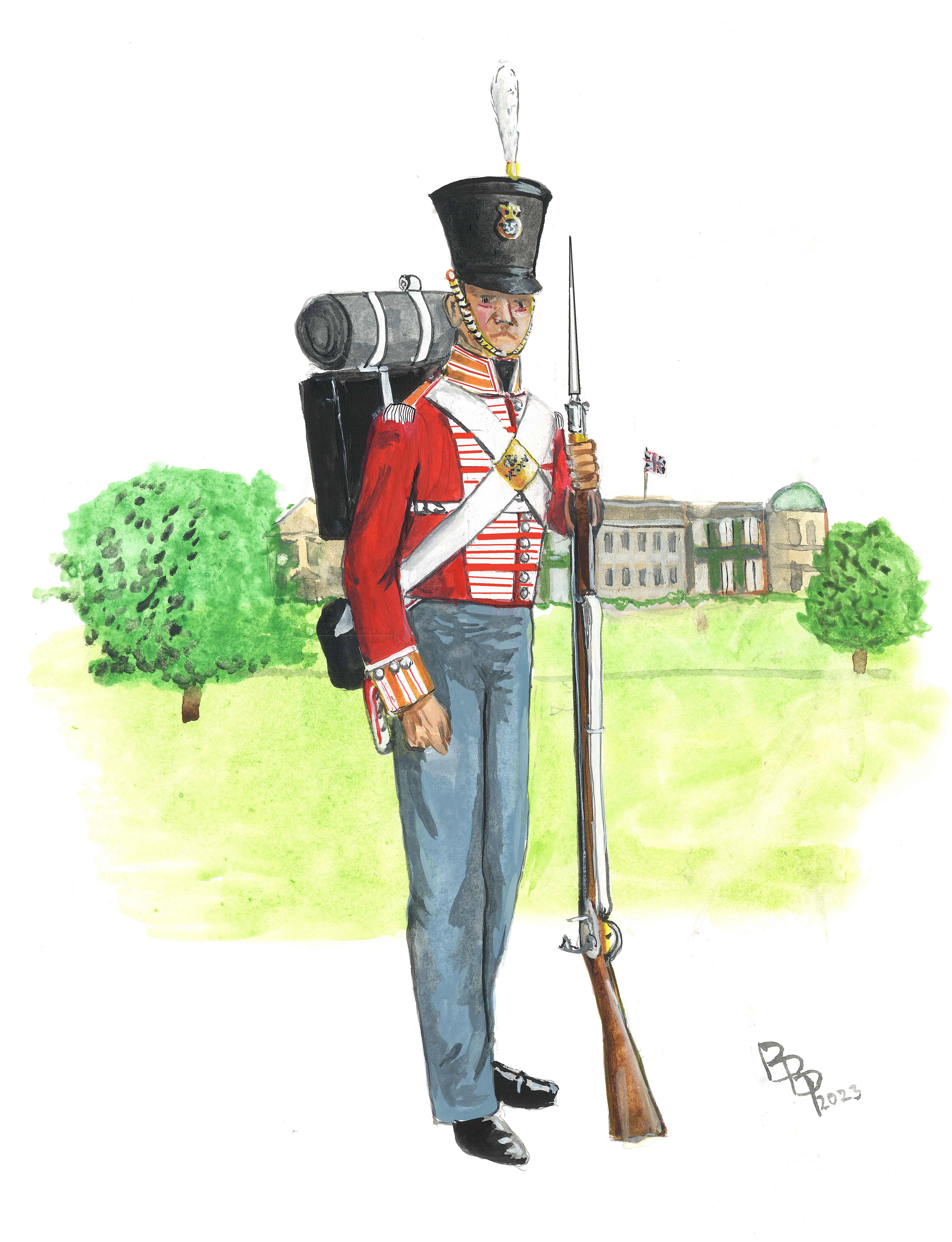 The soldier in the illustration is a private of the 1st Battalion in about 1829. He is wearing a uniform not far removed from Napoleonic times. The bell shaped “Prussian” shako was first introduced in 1816 and with a few modifications was worn until the 1840s. His tunic is the last to have the orange collar and cuffs (in the style first worn per 1768 regulations). The blue-grey trousers were authorized in 1823. He carries the “Land” pattern musket and bayonet used until 1852.